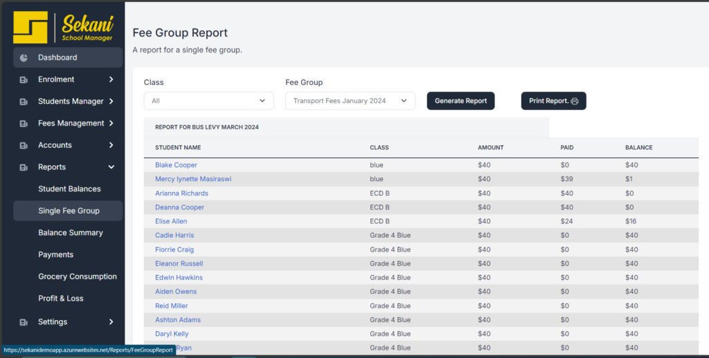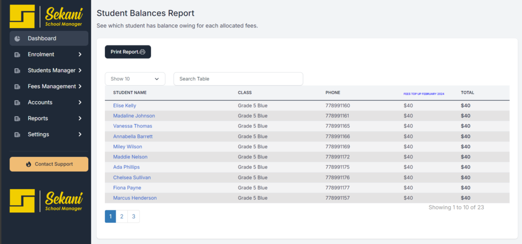 Sekani’s School Management System includes a comprehensive “Reports” module that simplifies financial tracking and management. Here’s what makes it unique: